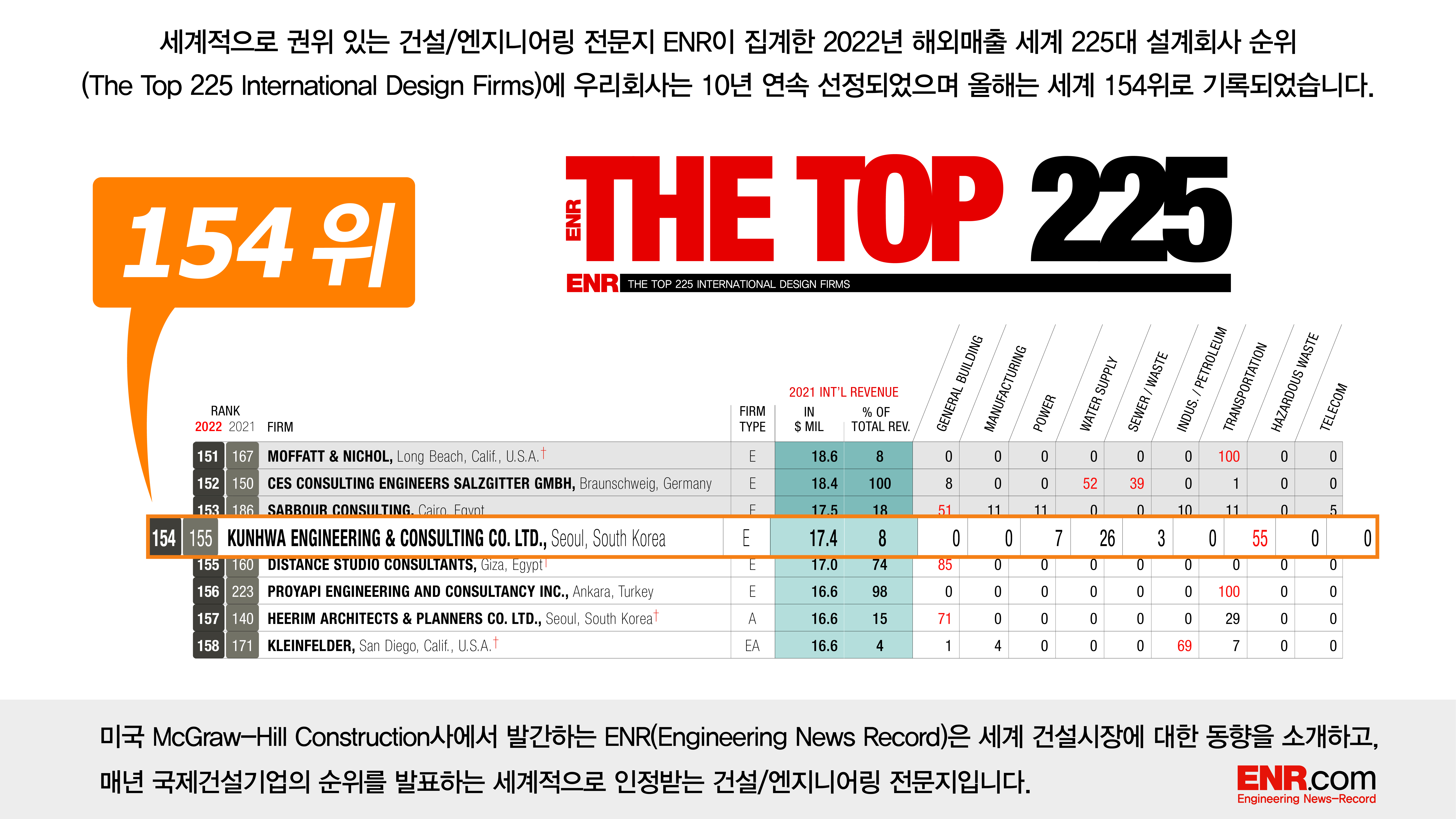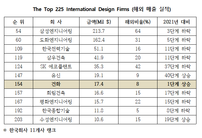 2021년 해외매출 실적을 기초로 하여 이번에 발표된 THE TOP 225 List에 이름을 올린 우리나라 기업은 모두 11개 기업입니다. 건설엔지니어링 분야에서는 도화엔지니어링(60위), 유신(147위), 건화(154위), 평화엔지니어링(167위), 한국종합기술(167위), 수성엔지니어링(203위) 등 6개 기업이 랭크되었습니다.