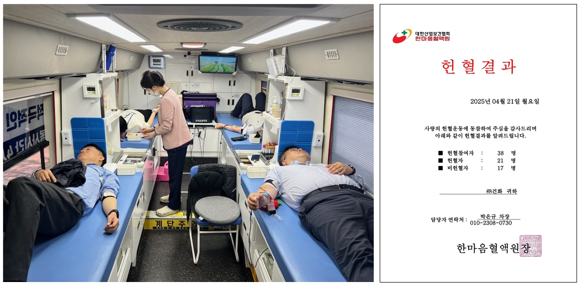 헌혈봉사에 참여한 임직원들은 사전 문진과 건강상태 확인을 거쳐 안전하게 헌혈에 동참하였으며, 당일 한마음혈액원의 이동 헌혈 차량이 사옥으로 직접 방문해 원활한 진행이 이뤄졌습니다. 단체 헌혈봉사를 처음 진행하면서 헌혈 기준이 생각보다 까다롭다는 것을 실감하기도 했습니다. 그 결과 참여의사를 밝힌 38명 중 21명이 실제로 헌혈에 참여할 수 있었습니다.