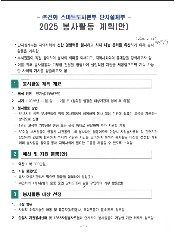 단지설계부는 도시 인프라를 계획 및 설계하고 이러한 기술을 통해 도시의 미래를 만들어가는 조직으로서, 기술뿐 아니라 사람과 지역을 잇는 따뜻한 가치를 함께 추구해 나가고자 합니다. 향후 헌혈봉사뿐 아니라, 매년 연말에 소외된 지역사회 구성원을 위한 자원봉사 등 다양한 활동을 통해 지속 가능한 나눔과 상생의 실천을 이어갈 계획입니다.