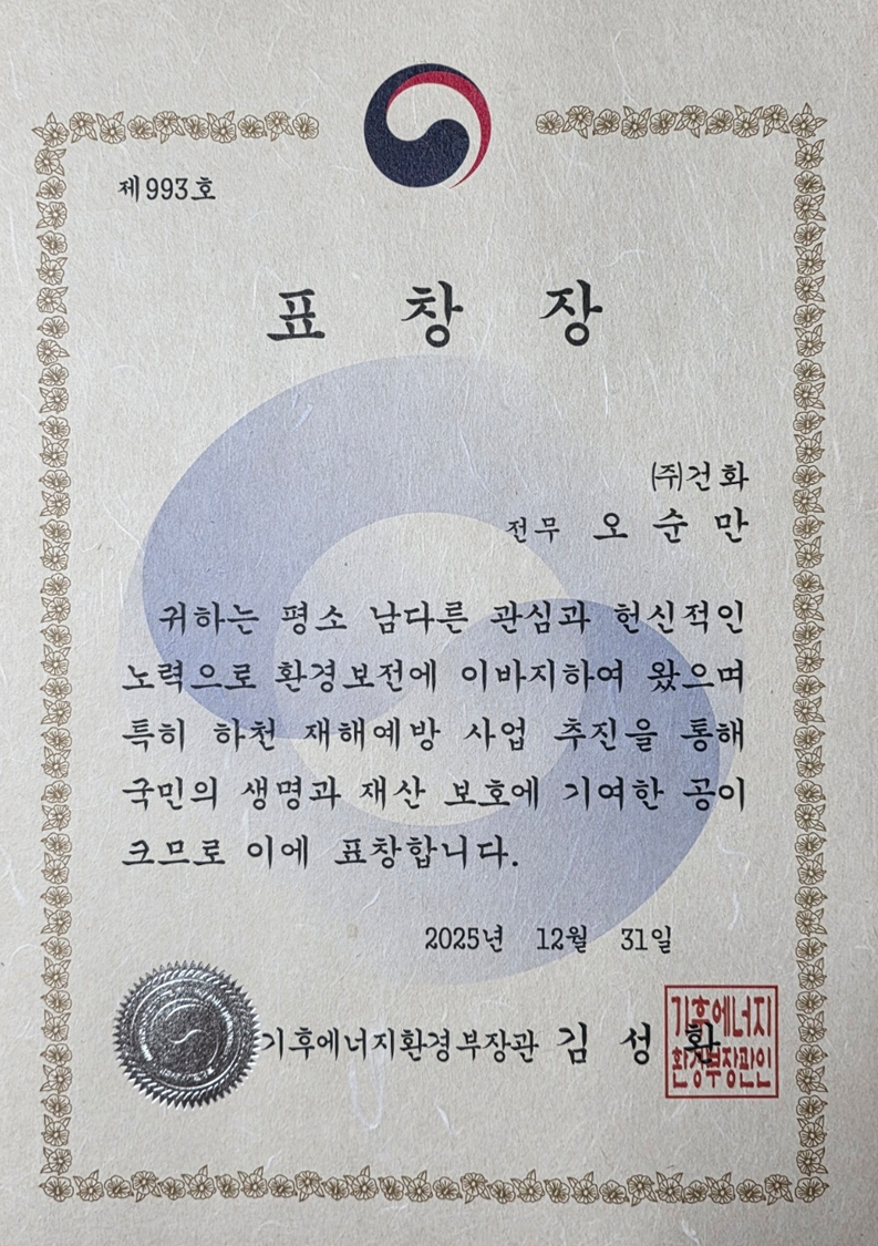 그 결과 안전과 환경을 동시에 고려한 지속가능한 하천 정비의 우수 사례로 평가받았으며 이러한 성과를 바탕으로 2025년도 종무식에서 기후에너지환경부 장관 표창을 수상하고 건설사업관리본부 오순만 전무가 표창장을 수여받는 영예를 안았습니다.