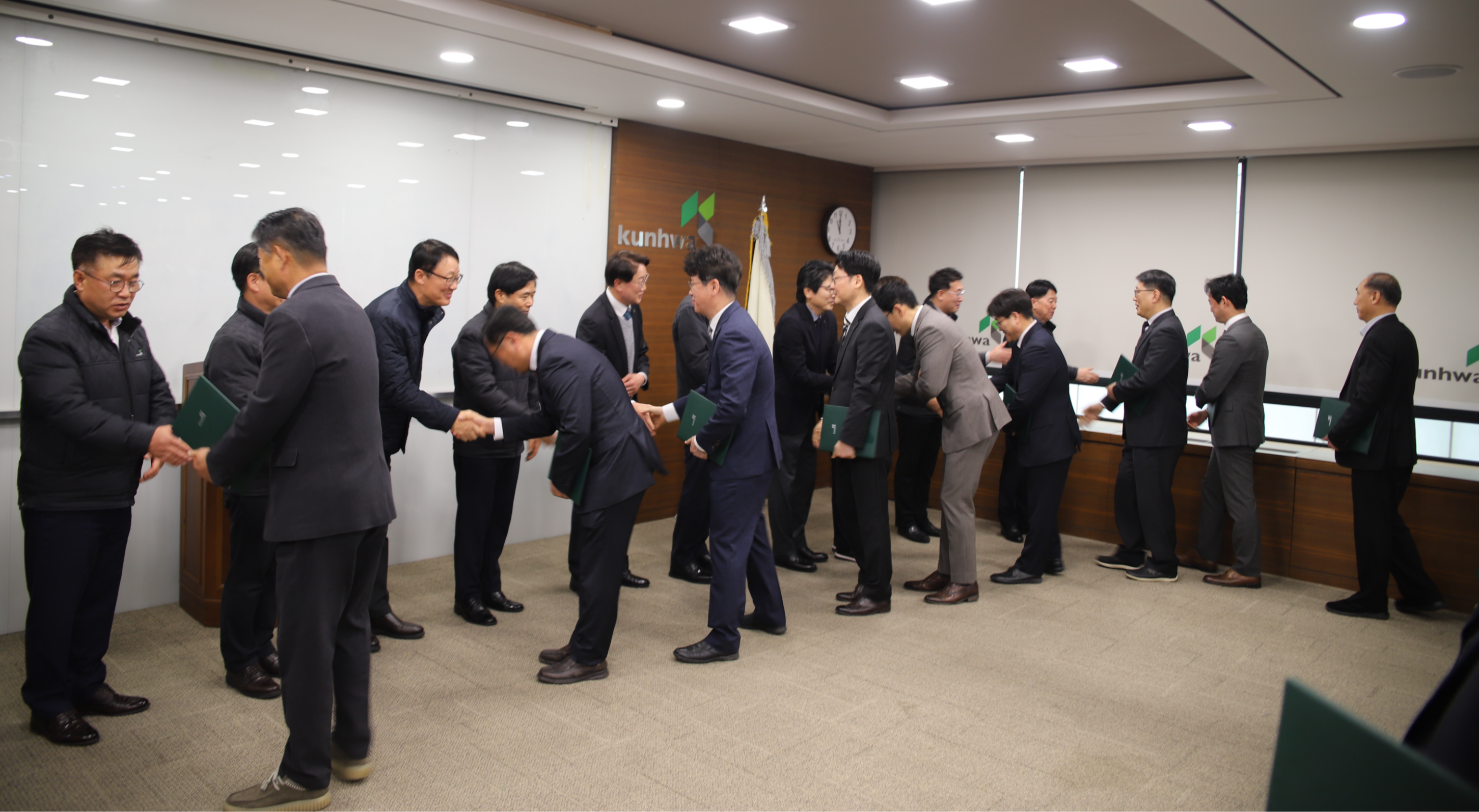 행사 말미에는 회장님의 인사말씀이 이어졌으며 변화하는 경영 환경 속에서도 기본과 원칙을 지키며 지속 가능한 성장을 이뤄가자는 당부가 전해졌습니다. 이후 승진자와 수상자, 참석 임원 간 악수를 통해 서로를 격려하며 이날의 의미를 함께 나누었습니다.