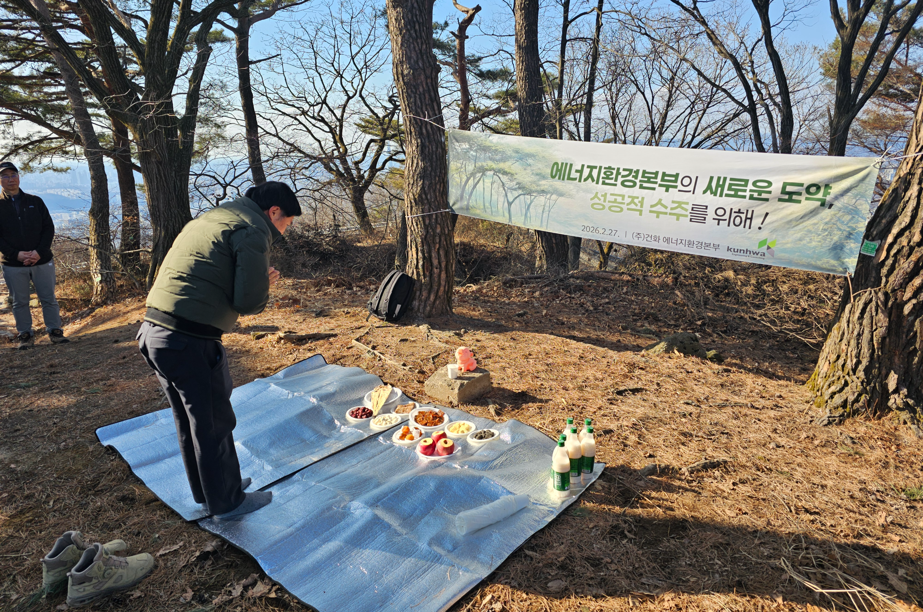 수어장대 인근에서는 본부장님을 시작으로 임직원들이 함께 모여 수주기원제를 진행했습니다. 정성껏 준비한 음식과 돼지 인형을 앞에 두고 건화의 번영과 에너지환경본부의 수주 목표 달성을 기원하며 진심을 담아 한 해의 안녕과 결실을 바라는 시간을 가졌습니다.